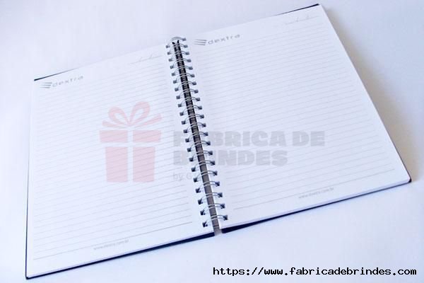 Caderno A-5 Personalizado com Elástico, capa dura, revestida em papel couchê 150gr, impressão 4 cores, acabamento capa/contra-capa: laminação e empastamento, miolo com 100 folhas pautadas em papel off-set 75gr, impressão 1x1 cor, layout exclusivo para cada cliente, fechamento com espiral metálicos duplo anel, wire-o e elástico, medidas: 15x21cm, embalado individualmente em saquinho plástico.