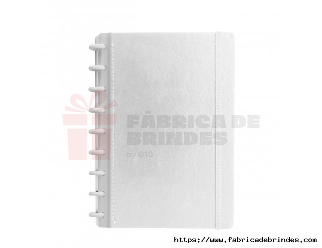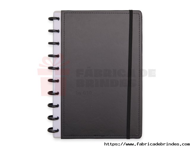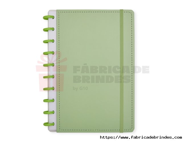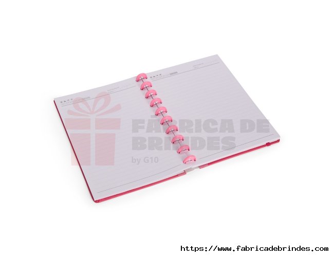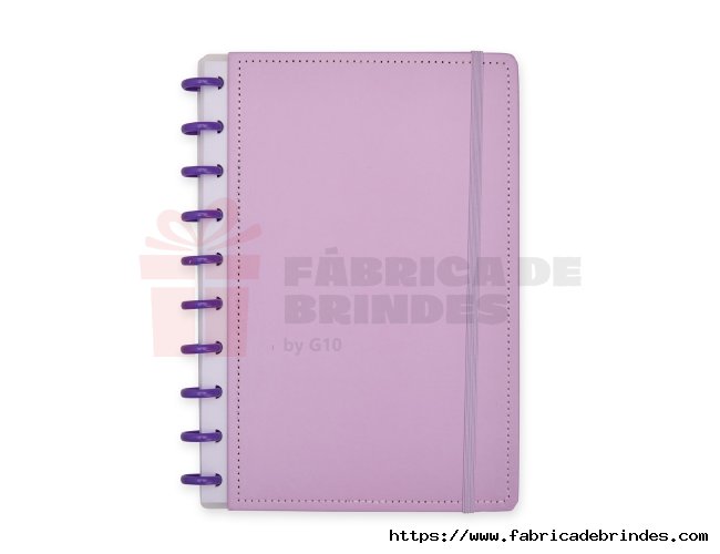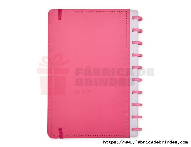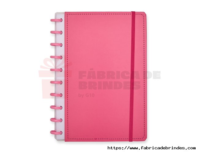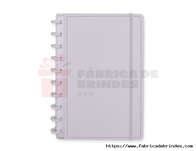 Caderno capa dura em papelão, com elástico para fechamento e encadernação em discos plásticos reposicionáveis, que permitem acrescentar ou remover folhas compatíveis com facilidade. Conta com aproximadamente 80 folhas brancas pautadas. Medidas: 19cm x 26cm.