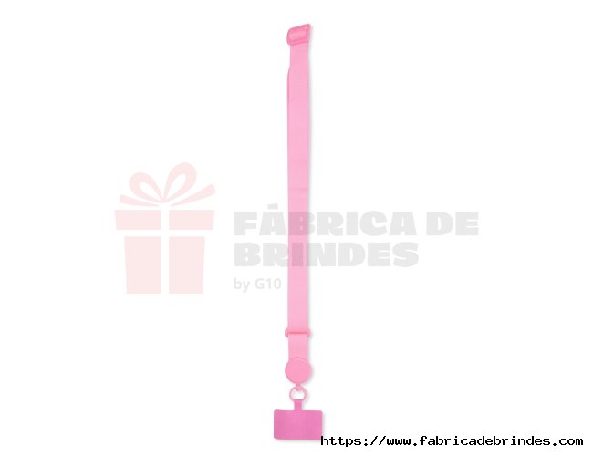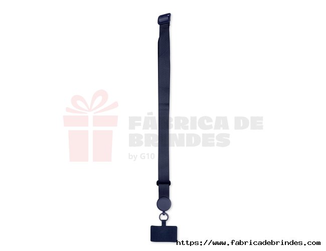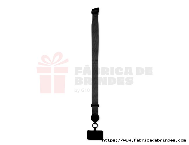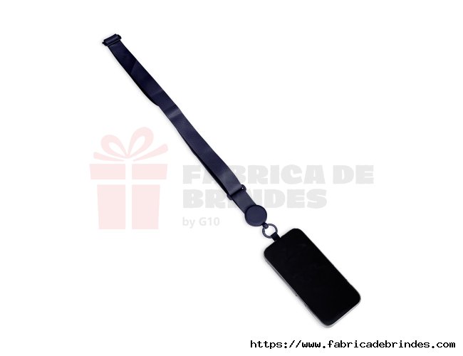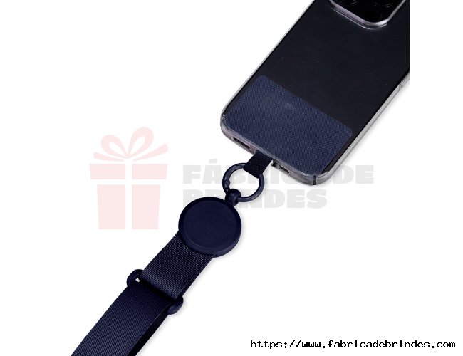 Cordão com alça ajustável para celular feito em poliéster. O acessório é fixado a um cartão retangular que se encaixa na parte interna da capa do celular, próximo à entrada de carregamento USB. Personalização inclusa.
