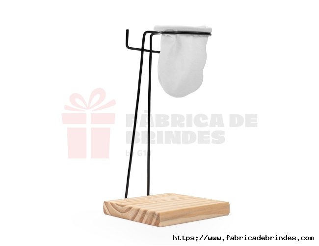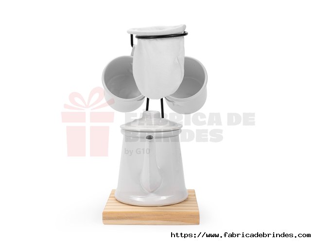 Kit Café Personalizado 4 Peças, um kit completo para preparar um café de forma especial em qualquer ocasião. O conjunto contém: 1 bule em alumínio com capacidade de 300ml, 2 xícaras em alumínio de 90ml cada e 1 coador em tecido com suporte de metal e base em madeira.